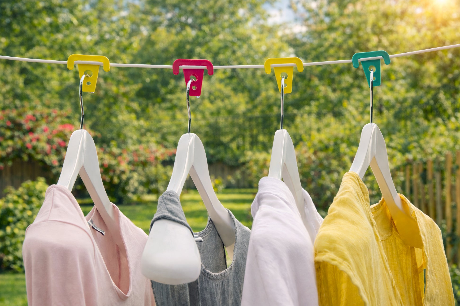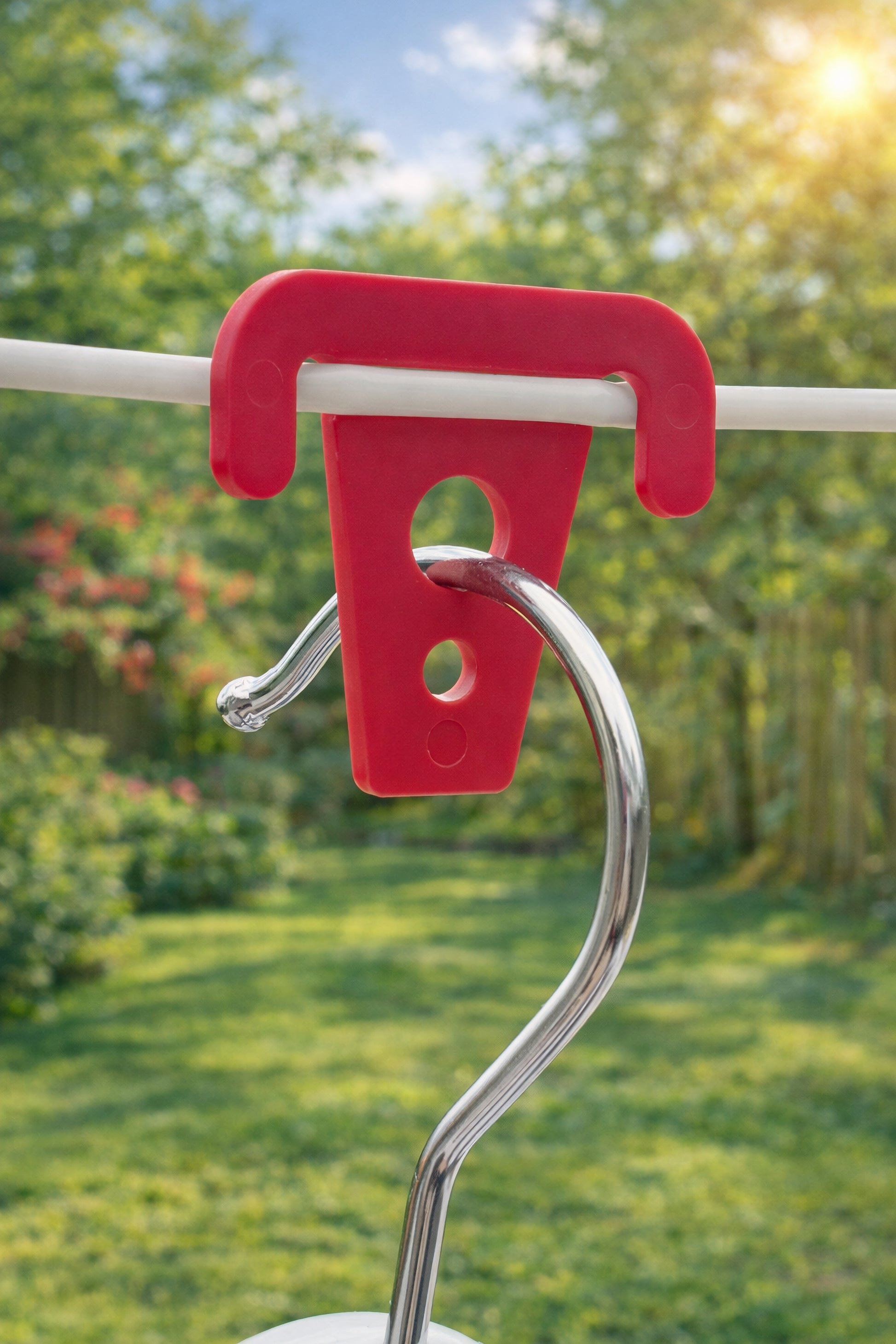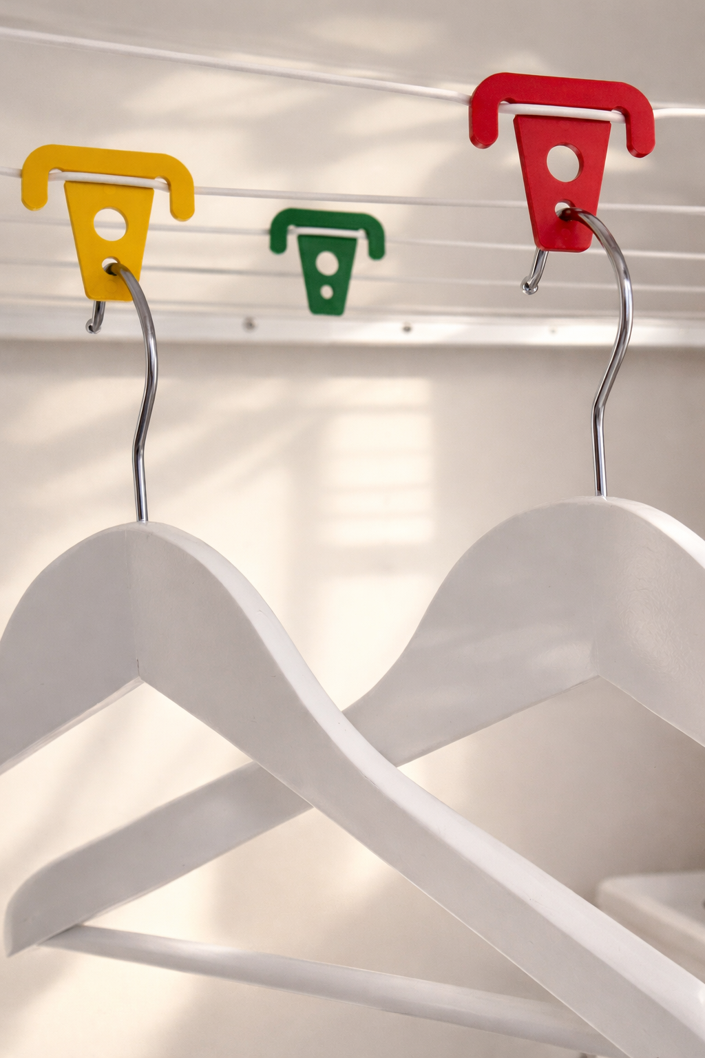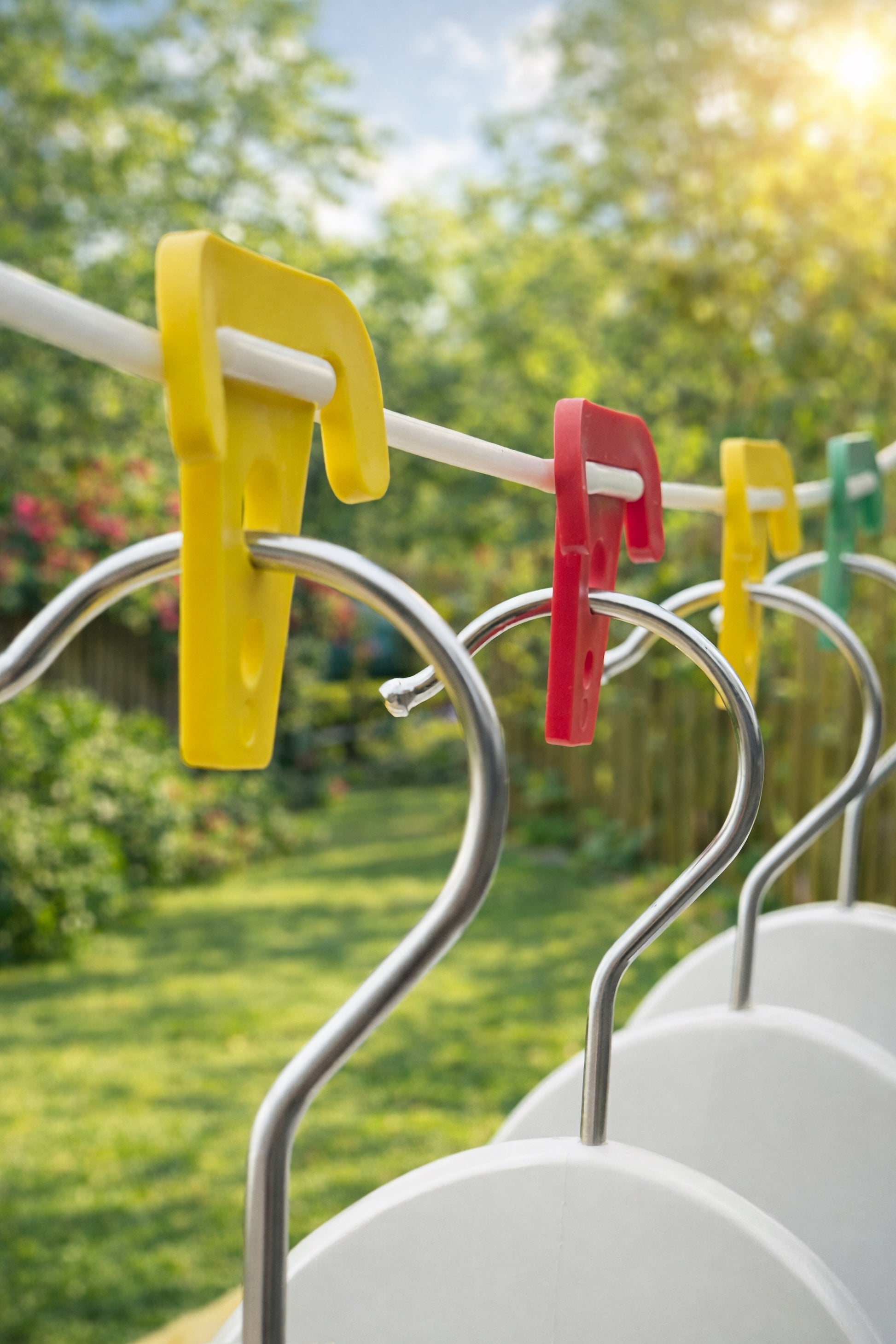 Praktische Sturmklammern, die Kleiderbügel bei jedem Wetter sicher an der Wäscheleine befestigen. Das Set enthält 10 Klammern in drei verschiedenen Farben: Rot, Gelb und Grün. Geeignet für jede Wäscheleine. Die Klammern werden an die Leine geklemmt und verhindern das Verrutschen der Kleiderbügel auch bei starkem Wind.